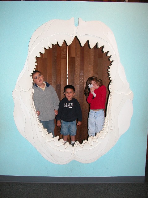 Inside the jaws of a great white! I told the kids to play dead, and one of them really did! Hehe. Caeli is posing with a couple of our neighbour's kids. She's been playing with them quite often and was happy to know that the older boy was in her preschool class too! |